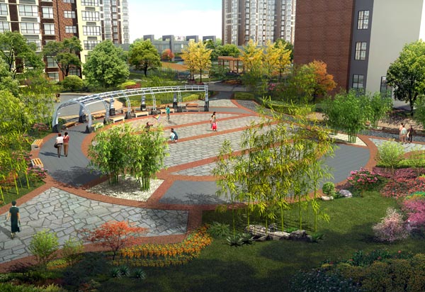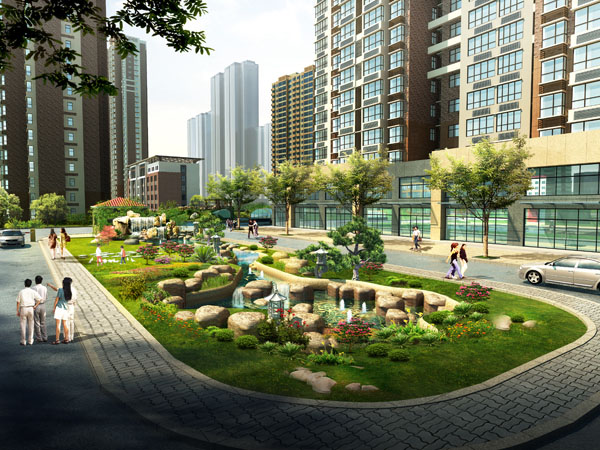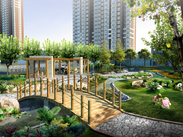 项目特色:在设计中将现代科技融入到景观设计中,采用一些高档材料、雕塑小品,凸显时代特色、生活时尚,提倡以人为本的个性化艺术风格,在设计中寻求人与自然的和谐,吸收自然环境中山水的意境。健康步道、小桥流水、花坛座椅与周围自然环境相融合,使居民获得一种“回归自然”,“返璞归真”的全新体验。